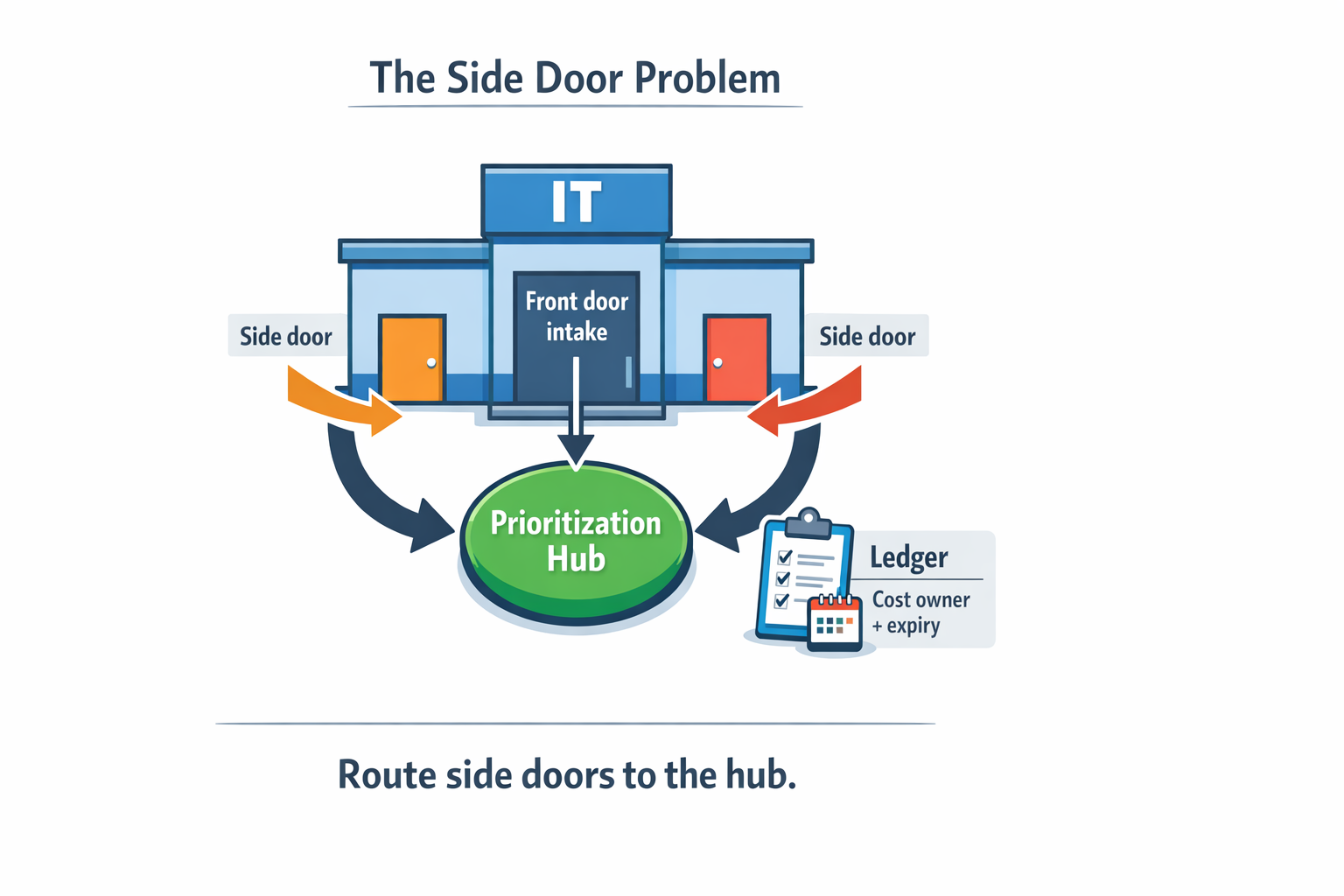 This is not a tool change and not a big process rollout. It’s routing discipline. Don’t fight side doors by pretending they won’t exist. Redirect them into a single prioritization hub where they can be classified, owned, and ordered against everything else. You keep the customer dialogue and the appearance of responsiveness, but you regain transparency and the ability to make explicit trade-offs. Exceptions stop being invisible and start becoming managed.